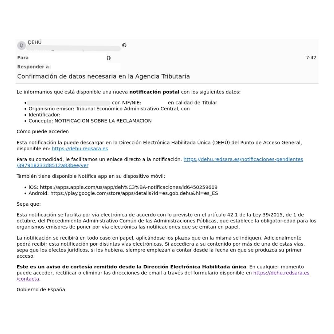Los correos detectados aparentan ser enviados desde la Dirección Electrónica Habilitada Única (DEHÚ), pero al revisar con detenimiento la dirección del remitente, se puede observar que es sospechosa. El asunto del correo puede variar, pero en todos los casos solicita la confirmación de datos en la Agencia Tributaria.